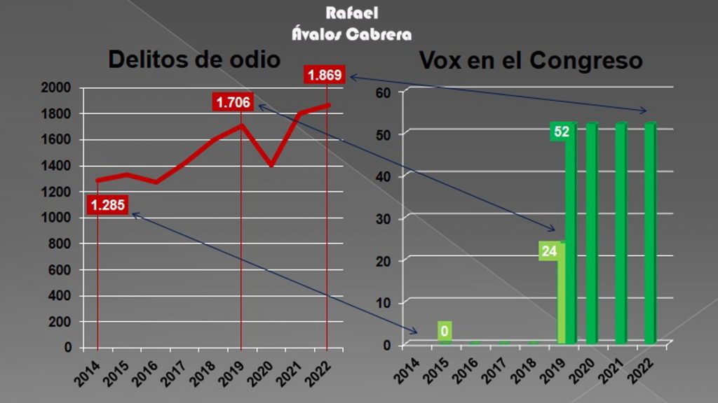 Por tanto, existe cierto nexo entre el auge de Vox -y otros grupos- y el alza de actos delincuenciales por desprecio al ‘diferente’. A lo largo de estos años, el partido liderado por Santiago Abascal creció de manera exponencial. Y no sólo eso sino la aceptación de su ideario, en cuanto a apoyo en las urnas pero también a nivel mediático y social. Al mismo tiempo, ascendieron significativamente las cifras de delitos propiciados por una mentalidad intolerante. ¿Es sólo casualidad?